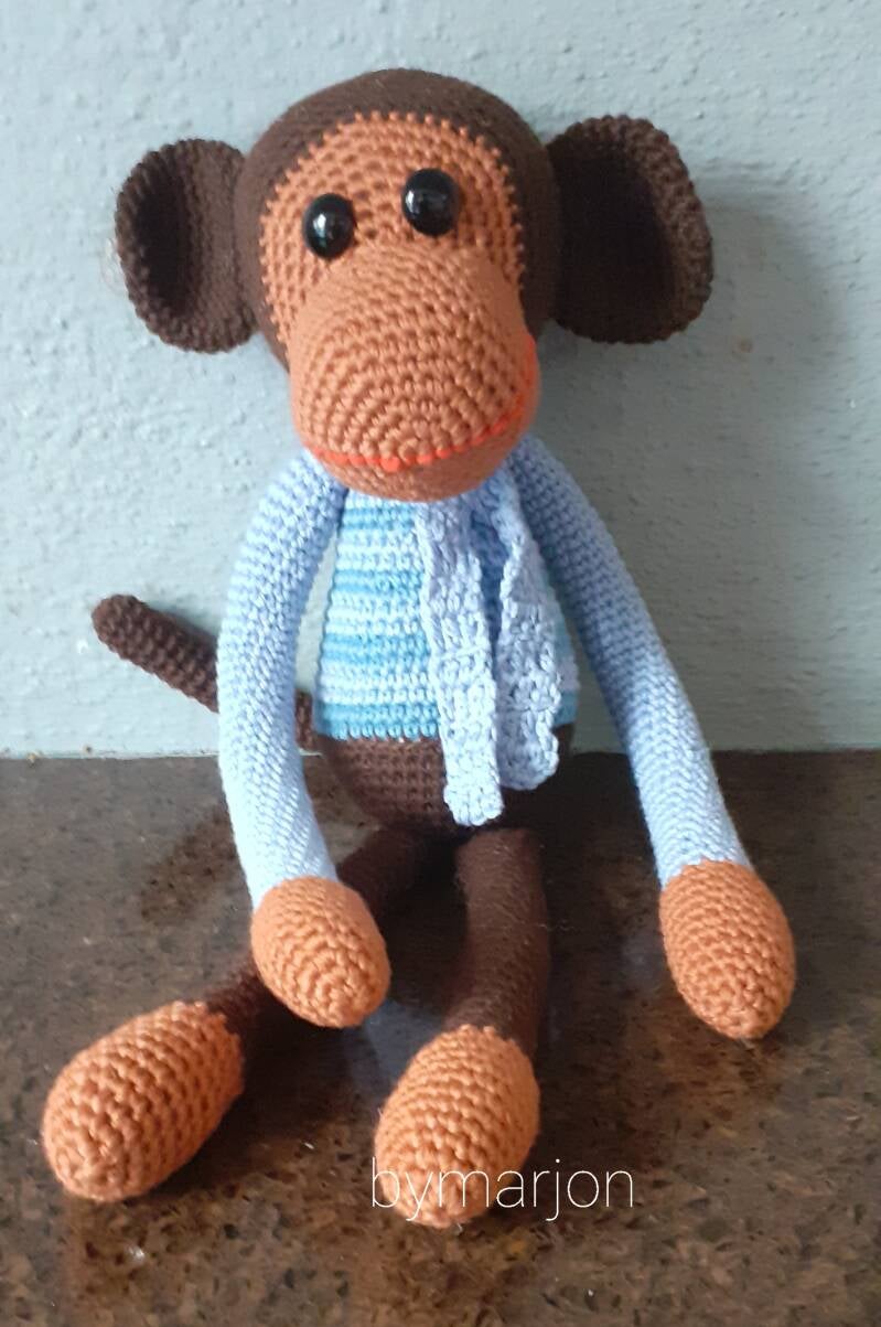 Gehaakte aap met blauwe trui.